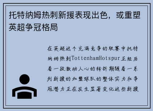 托特纳姆热刺新援表现出色,或重塑英超争冠格局